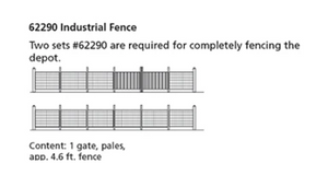 The Piko 62290 G Scale Industrial Fence is a decorative accessory designed to replicate perimeter fencing for industrial complexes. The set includes plastic fence panels and posts, with a gate included for access. Two sets are recommended to fully enclose a tank depot.