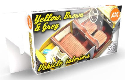 AK Interactive 11684 Cars & Civil Vehicles Series: Yellow, Brown & Grey Interiors 3G Acrylic Paint Set (6 Colors) 17ml Bottles . This is a brand new item in original manufacturer packaging. This is a genuine AK Interactive product.