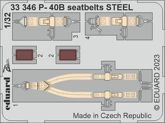 Eduard 33346 1/32 Aircraft- P40B Seatbelts Steel for LNR (Painted). This is a brand new item in original manufacturer packaging. This is a genuine Eduard product.