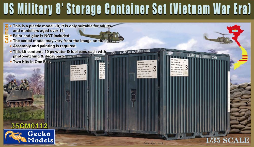 Gecko Models 350112 1/35 US Military 8' Storage Container Set Vietnam War (10). This is a model kit. Assembly, painting, and detailing required. This is a genuine Gecko Models product.