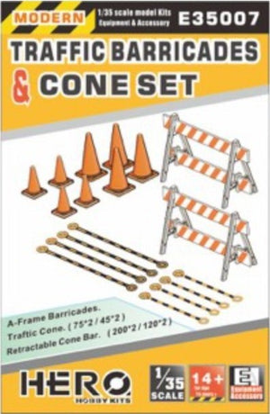 Hero Hobby E35007 1/35 Modern Traffic Barricades (2), Cones (8) & Cone Bars (8). This is a model kit. Assembly, painting, and detailing required. This is a genuine Hero Hobby product.