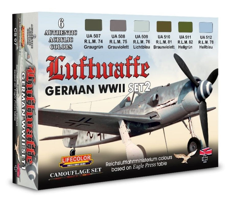 Lifecolor CS7 German WWII Luftwaffe #2 Camouflage Acrylic Set (6 22ml Bottles). This is a brand new item in original manufacturer packaging. This is a genuine Lifecolor product.