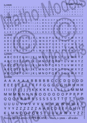 Matho Models 80014 Multi-Scale Black Upper Case 1-3mm Lettering Decals. This is a brand new item in original manufacturer packaging. This is a genuine Matho Models product.