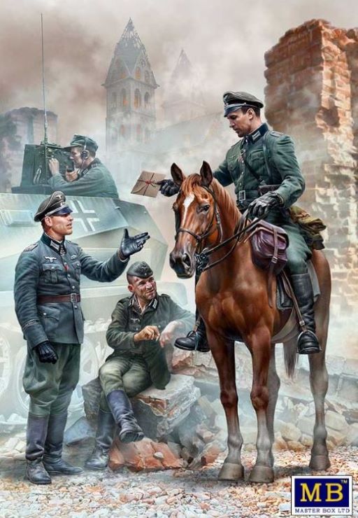 Master Box Models 35212 1/35 Urgent Dispatch WWII German Military Men (4) & Horse. This is a model kit. Assembly, painting, and detailing required. This is a genuine Master Box Models product.