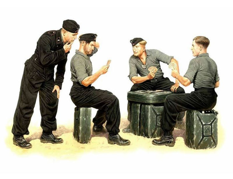 Master Box Models 3525 1/35 WWII German Tankmen Skats Players (4) & Jerry Cans (6). This is a model kit. Assembly, painting, and detailing required. This is a genuine Master Box Models product.