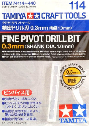 Tamiya 74114 Fine Pivot Drill Bit (0.3mm Shank Dia. 1.0mm). This is a brand new item in original manufacturer packaging. This is a genuine Tamiya product.